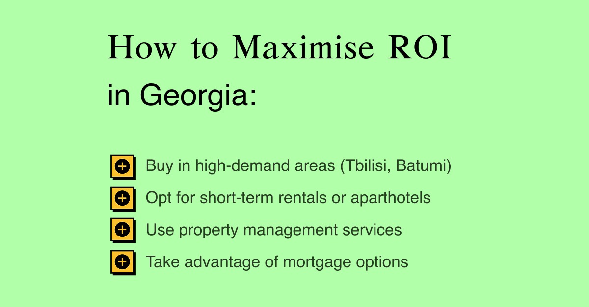Maximising Profits in Georgia Investors can take specific steps to improve returns. Choosing high-demand areas like Tbilisi and Batumi ensures steady rental demand. Short-term rentals or aparthotels often provide higher yields, while professional property management optimises occupancy and reduces hassle. Additionally, leveraging mortgage options wisely can boost overall profitability.